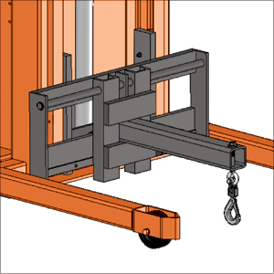 Boom with HookFork carriages can be equipped with a boom and hook for lifting and suspending loads with chains or lifting straps.